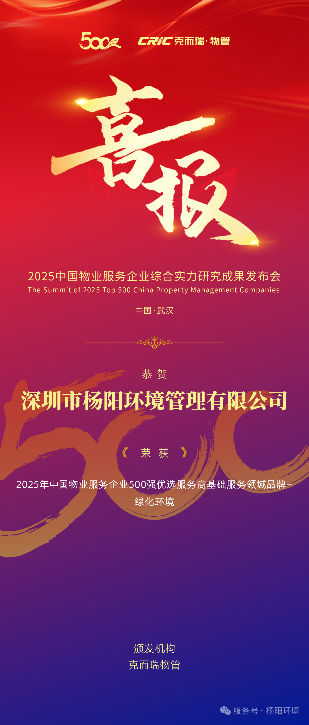 在「2025中国物业服务企业综合实力研究成果」中,深圳市杨阳环境管理有限公司荣获“2025年中国物业服务企业500强优选服务商基础服务领域品牌—绿化环境”奖项。