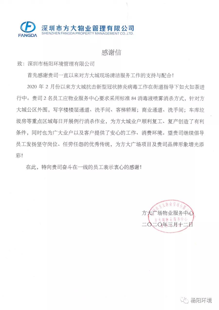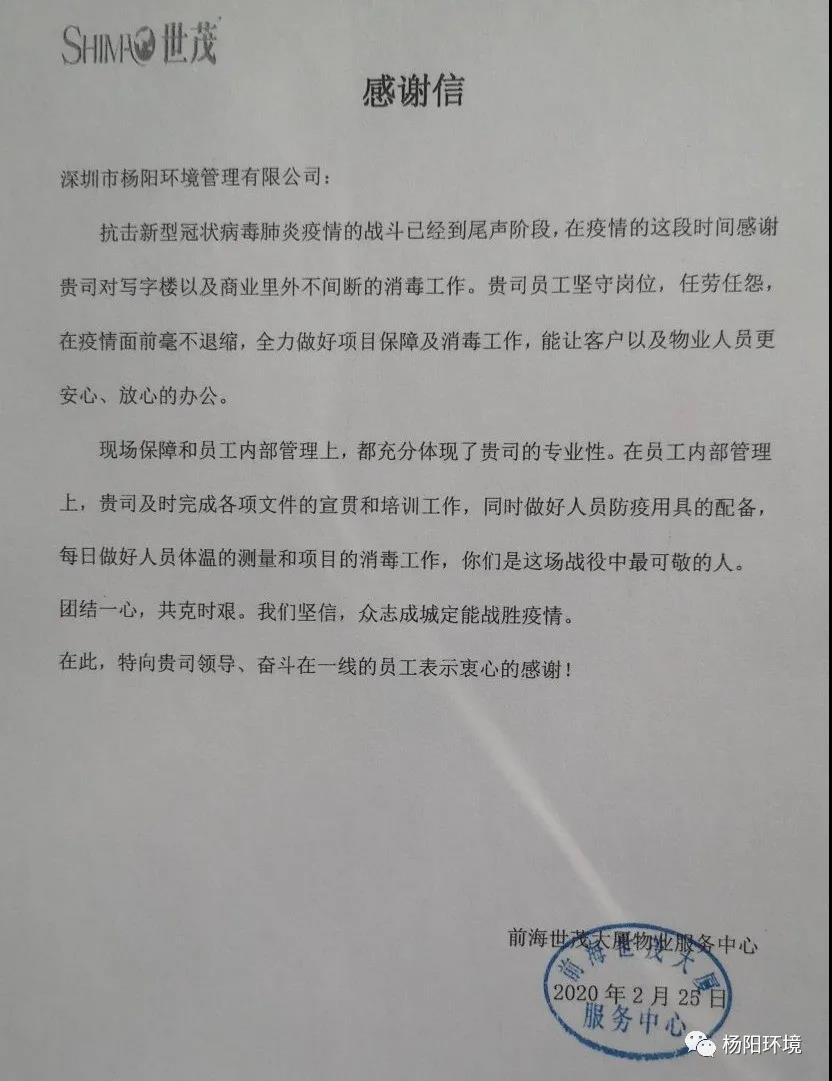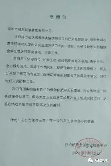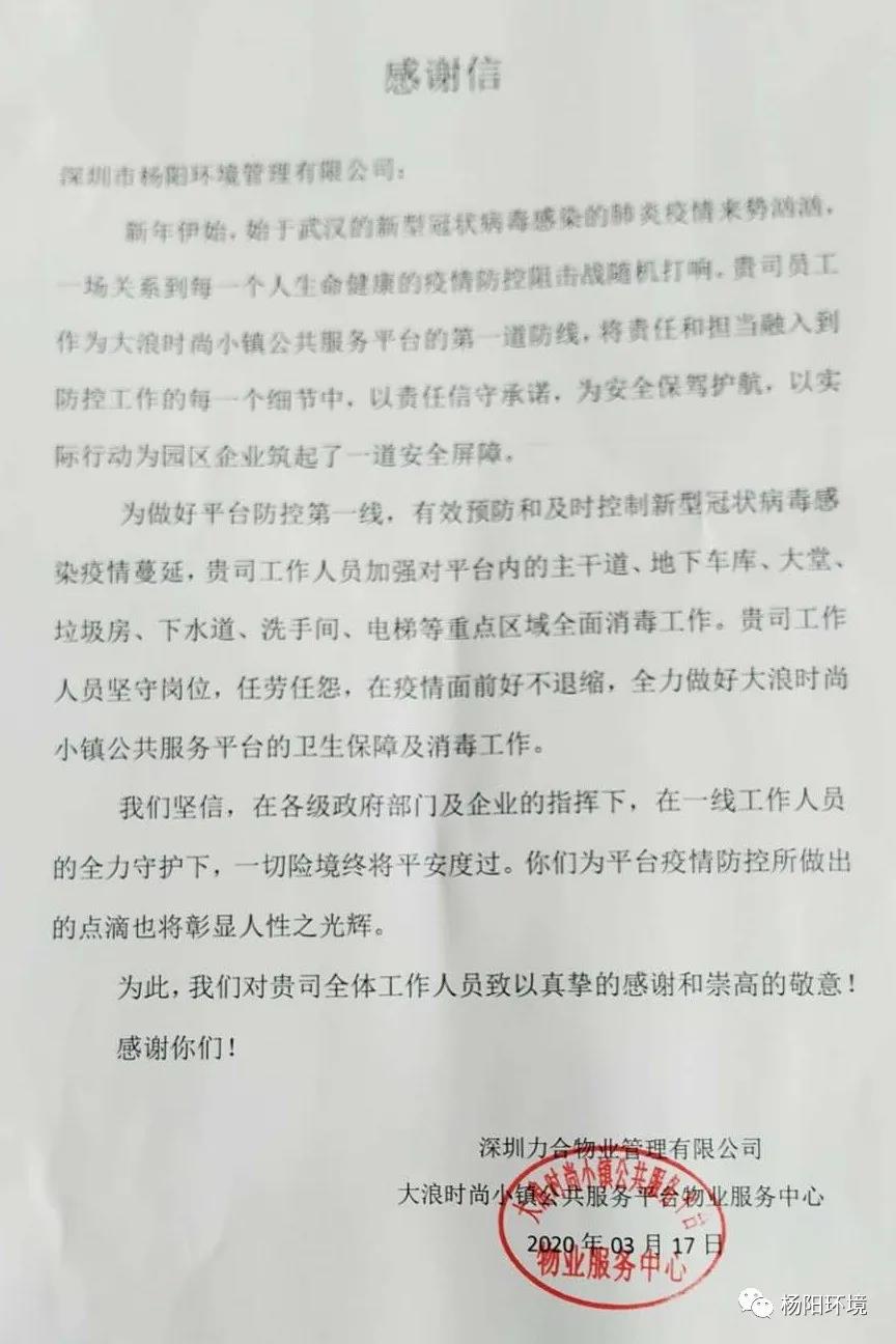 在这场疫情防控阻击战中,杨阳环境时刻以“满格电”奋战“疫”线,共克时艰,切实做好疫情防控期间各项目的消杀和环境卫生保障工作。近日,公司收到多封来自各项目的感谢信。