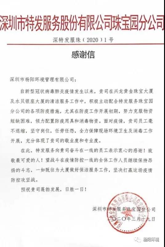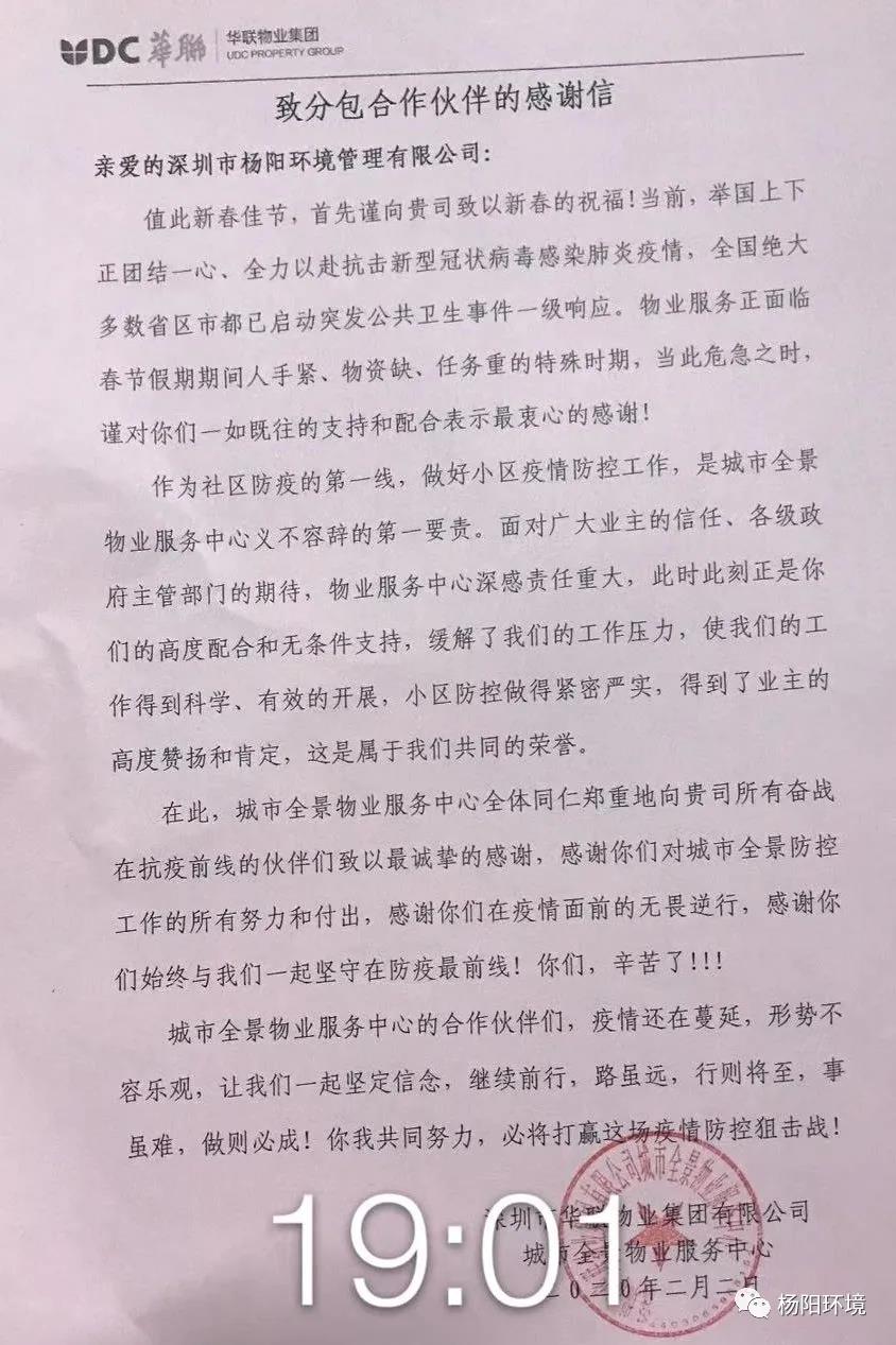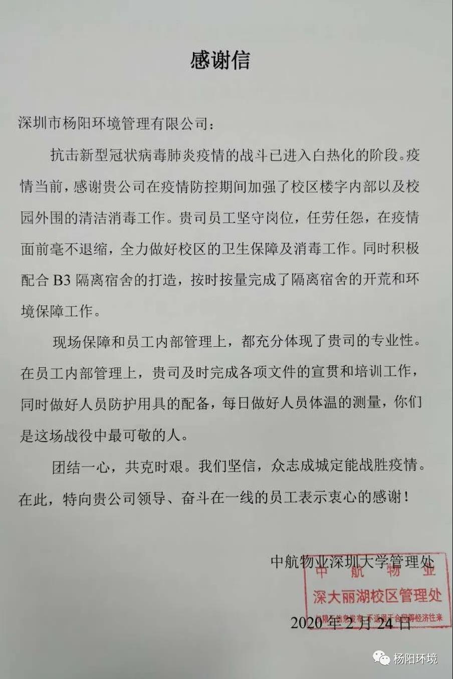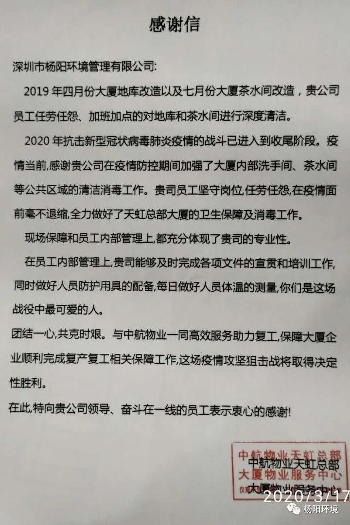 在这场疫情防控阻击战中,杨阳环境时刻以“满格电”奋战“疫”线,共克时艰,切实做好疫情防控期间各项目的消杀和环境卫生保障工作。近日,公司收到多封来自各项目的感谢信。