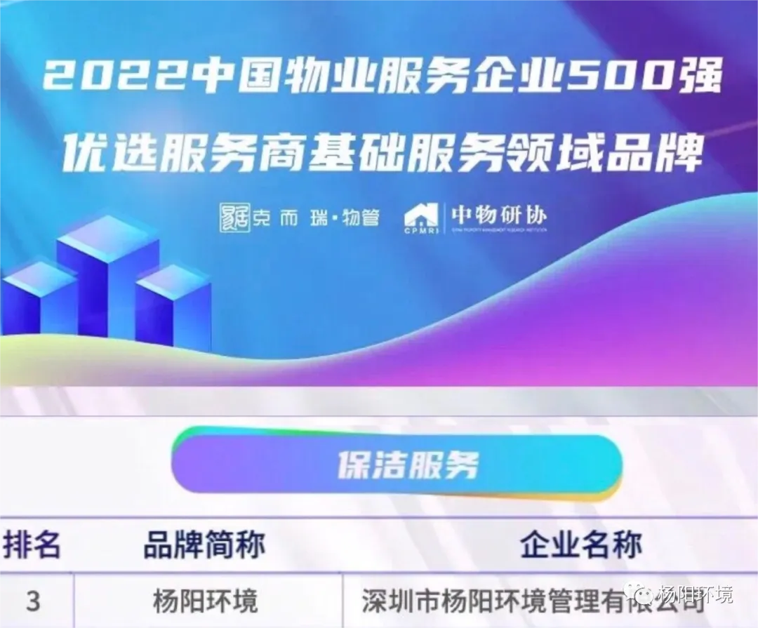 杨阳环境凭借先进的管理理念、诚信的服务以及良好的客户口碑连续三年跻身其中,并且在今年的基础服务领域—保洁服务中排名前三。