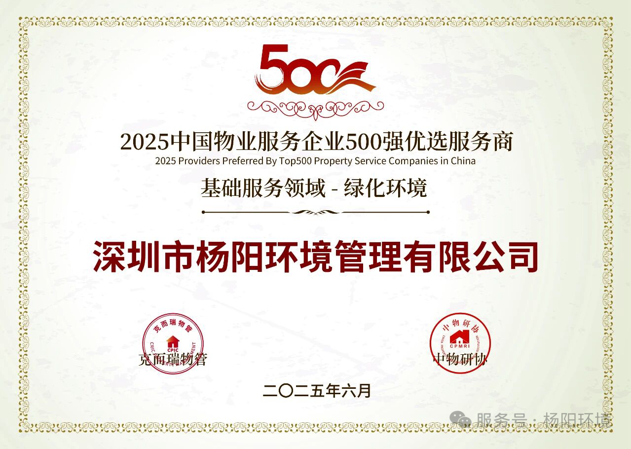 在「2025中国物业服务企业综合实力研究成果」中,深圳市杨阳环境管理有限公司荣获“2025年中国物业服务企业500强优选服务商基础服务领域品牌—绿化环境”奖项。